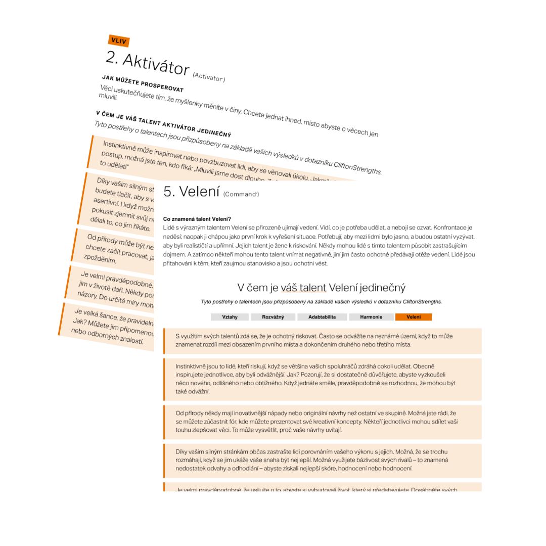 Právě z něj vznikl talentový dotazník CliftonStrengths® od společnosti Gallup®. Pomáhá pojmenovat Váš jedinečný talentový profil – způsob, jak přemýšlíte, cítíte a přirozeně reagujete. Dotazník pracuje s 34 oblastmi talentu a vyplňuje se formou rychlých voleb mezi dvojicemi výroků.